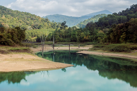 Fantastic mountain lake in winter season at noon, blue sky view in Thailand.
