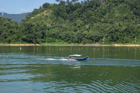PERAK, MALAYSIA - JULY 10, 2018 : Tourist enjoying a boat ride to discover peace environment of 130 million years old Royal Belum Rainforest Park acrossing the Temengor Lake at Pulau Banding, Perak.