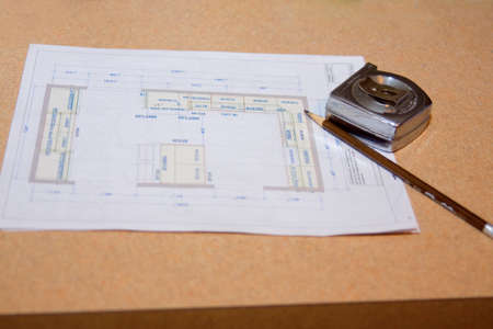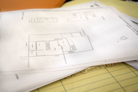 Paper architectural drawings and blueprint.