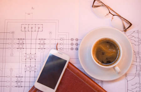 Cup of coffee, cellphone, drawing glasses on table top view.