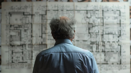 Engineer looking at the blueprint of the house, view from above