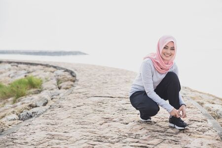portrait of sporty asian woman wearing hijab fixing the shoelaces during jogging with copy space