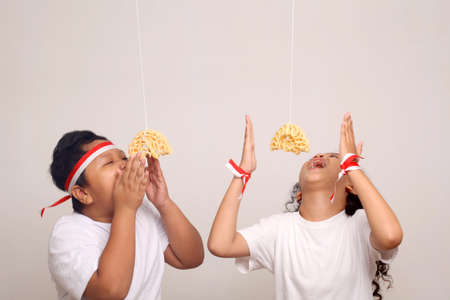 Asian kids celebrating indonesian independence day with cracker eating contest.