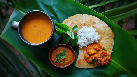 Experience a vibrant traditional Indian meal beautifully arranged on a banana leaf, showcasing flatbread, fragrant rice, flavorful lentils, and fresh chutney.