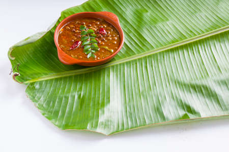 Kadala curry or chana masala curry or chick pea curry arranged in aterracotta earthen ware on a fresh green banana leaf with white background.