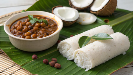 Puttu,Raw rice puttu,Arisi Maavu Puttu with chana or kadala curry, Bengal gram cuirry _breakfast items made using raw rice flour, an ideal combination arranged in a black plate with wooden background