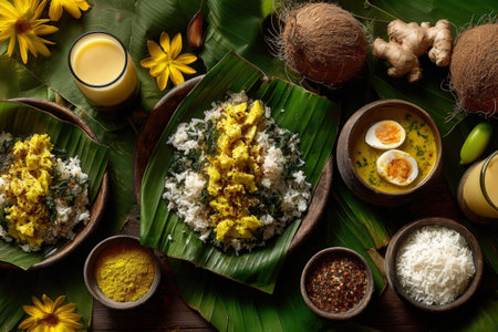 Coconut rice presented on banana leaves, accompanied by boiled eggs and spices, surrounded by tropical elements and refreshing drinks, creating a vibrant dining atmosphere