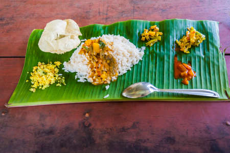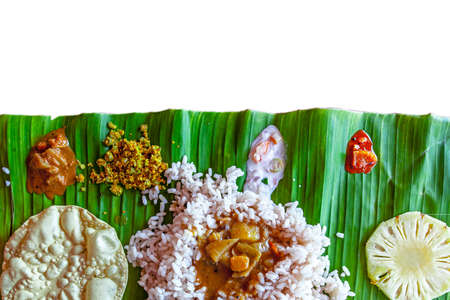 Kerala Food, Traditional food Onam Sadya served on a banana leaf on Festival day onam, Vegetarian meal with rice and curries