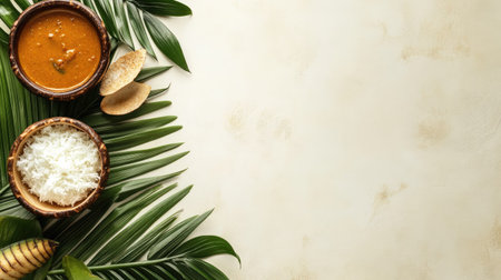 A visually appealing arrangement featuring a bowl of curry and rice complemented by lush green leaves, ideal for food-related themes and culinary inspiration.