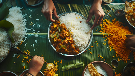 A top view of hands serving Indian food with rice and vibrant spices on a banana leaf. cultural dining. A.I.