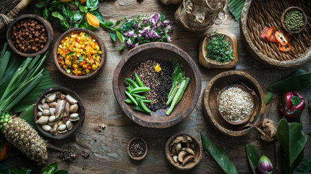 A selection of colorful fresh ingredients, including grains, vegetables, and herbs, artfully arranged in rustic wooden bowls on a textured surface.
