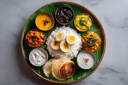 Traditional south indian feast on banana leaf with varied dishes