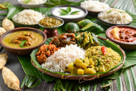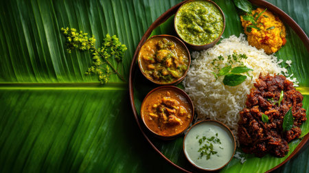 A delightful array of traditional Indian dishes presented on a banana leaf. This vibrant meal features rice, curries, and vegetables, showcasing rich flavors.