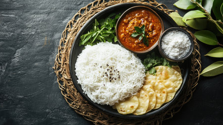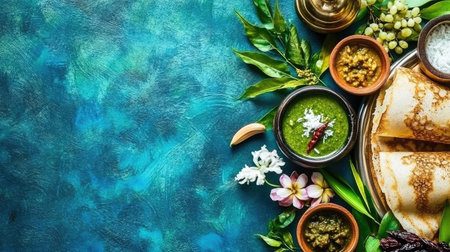 Brightly Colored Traditional Indian Meal Served on Decorative Plate with Fresh Ingredients, Accompaniments, and Festive Decorations for Cultural Celebration