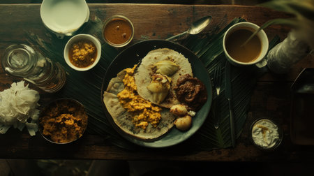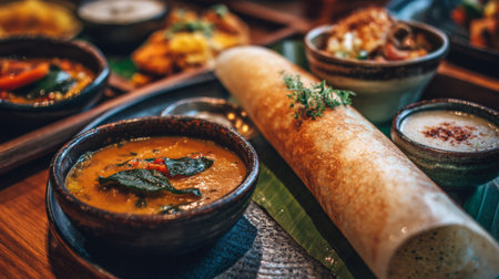 Experience a traditional South Indian breakfast featuring dosa, sambar, and coconut chutney elegantly arranged on a rustic table, perfect for culinary exploration and sharing.