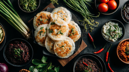 Experience a vibrant breakfast scene with soft idlis, an array of colorful chutneys, and fresh vegetables, creating a delightful South Indian culinary feast.