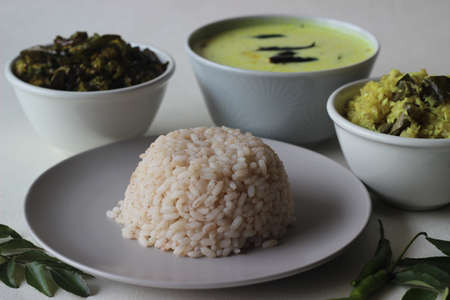 Vegetarian meals prepared in Kerala style. The serving includes boiled red rice, stir fried onions with grated coconut, stir fried okra, tempered buttermilk and poppadum. Shot on white background.