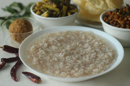 Rice porridge or Kanji along with spicy coconut red chilly chutney, stir fried boiled red cowpea beans and stir fried raw banana slices. A favourite meal of Kerala. Shot on white background