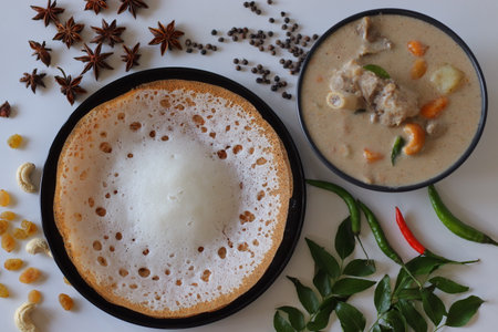 Kerala style appam with mutton stew in coconut milk gravy, styled with curry leaves, spices, and cashews. A traditional South Indian breakfast perfect for festive, cultural, and culinary themes.