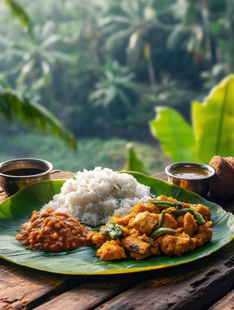 Traditional Kerala feast with rice, curries, and pickles served on a banana leaf with a variety of side dishes.