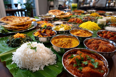 A stunning array of traditional Indian dishes served on a banana leaf, showcasing diverse flavors, vibrant colors, and a festive atmosphere perfect for gatherings and celebrations.