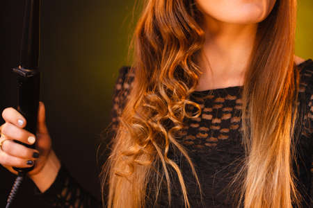 Close-up hairdresser twists the girl's long hair and makes curls. Creating a girl's hairstyle, a place for text, a hairdresser tool