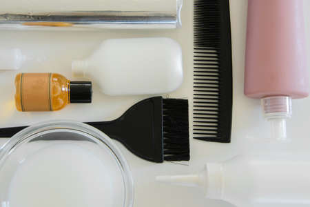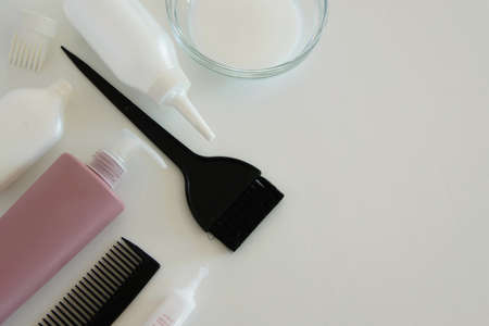 Hair dye tools on white background, space for text