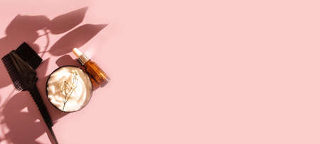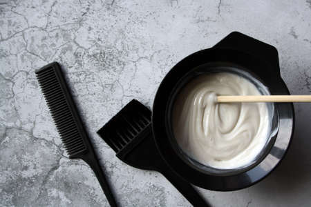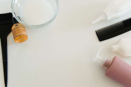 Professional hair dresser tools with copy space. Brush, comb, hair dye in a bowl.