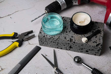 Detail of accessories for hair cutting and styling on white table. Top view. Landscape composition.