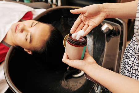 Hairdresser applying smoothing, hydraiting mask that provides great moisturizing benefits on damaged hair of female client