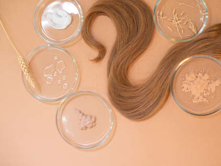 Eco-friendly and modern cosmetics for hair care, a set of ingredients and bottles on a brown background. Hair and combs