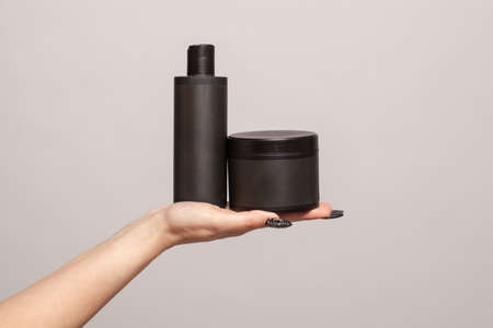 Plastic bottles of hair care and beauty products in female hand against blonde head.