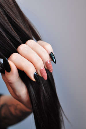 Female hands with hair combo on dark background