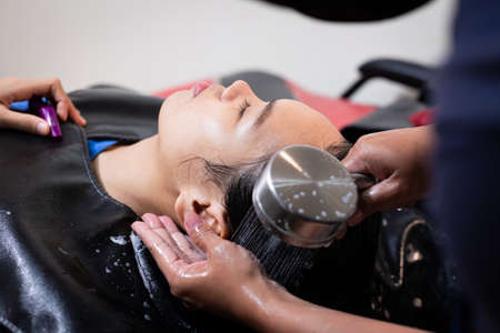Young asian woman getting a hair wash by hairdresser at hair salon. Hairdresser washing hair of a young woman. Beauty salon, hair care and people lifestyles concept.