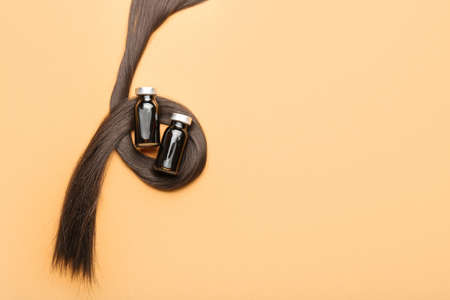 Brunette hair strand with medical bottles on orange background