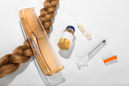 Braided hair with comb, ampules and syringe on white background