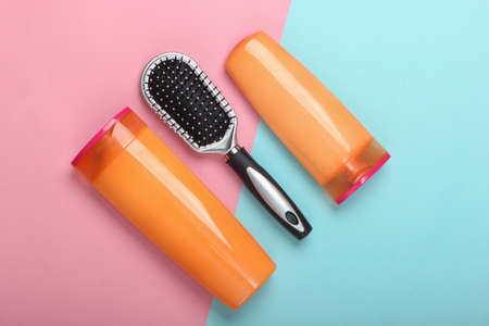Shampoo bottles, hair conditioner, hair brushes on blue pink background. Hair care. Hygiene. Beauty flat lay