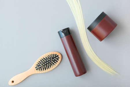 A lock of blonde hair, hair care products and a comb on a colored background