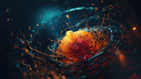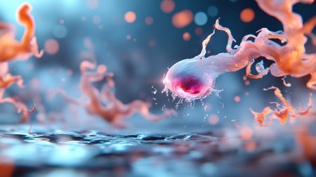 A translucent cell-like structure with a red nucleus, featuring fluidic, orange extensions and water droplets, set against a blurred blue background.