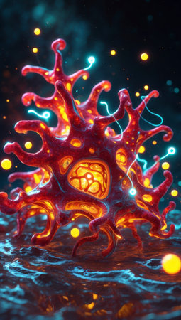 A detailed illustration showcases a colorful cell with filaments and textures, highlighting its complex structures and biological features in a laboratory environment.
