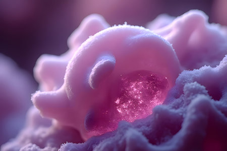 a vibrant 3d animation showcases a cell adorned with intricate embellishments. the cell is beautifully colored in light indigo and pink hues, reminiscent of a petzval 85mm f22 lens. the addition of light cyan and orange accents adds depth to the image. this captivating artwork resembles tilt-shift photography and resembles detailed miniatures found in medical imaging films. ai generated