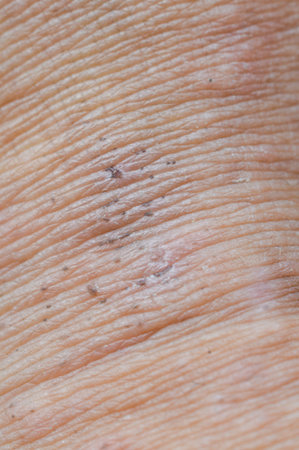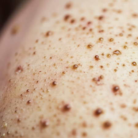 Close up view of skin exhibiting small bumps featuring various textures and colors highlighting skin condition and surface variations.