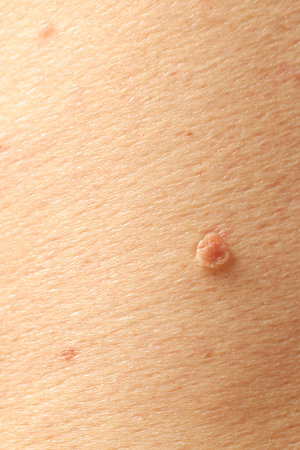 Close Up photo of skin tag or skin mole on a human body before medical dermatologist treatment with liquid nitrogen. Skin mole tag removal. Dermatological beauty treatment