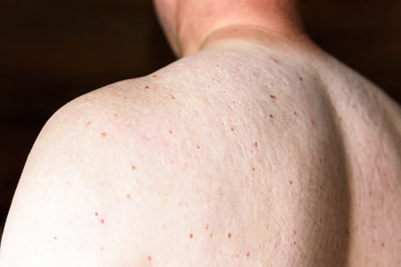 Checking benign moles. Close up detail of the bare skin on a man back with scattered moles and freckles. Pigmentation. Birthmarks on skin