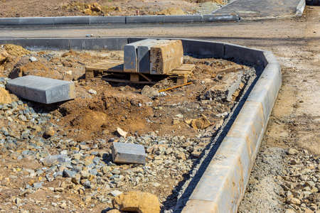 construction of secondary road junction and installation of curb stone with preparation of crushed stone base for sidewalk, selective focus