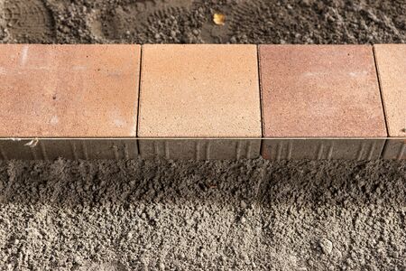 New paving bricks or stones on a prepared base in a construction and building concept.