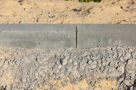 construction of road and sidewalk, close-up of a large curb