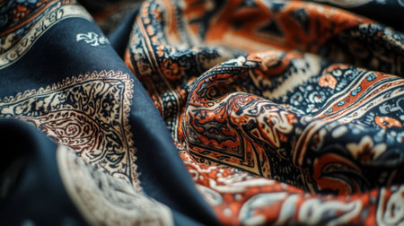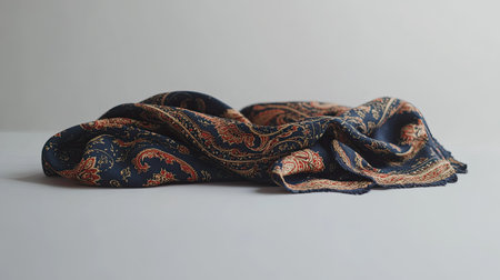 This image features an elegantly draped paisley patterned scarf, showcasing intricate details and vibrant colors against a neutral backdrop.