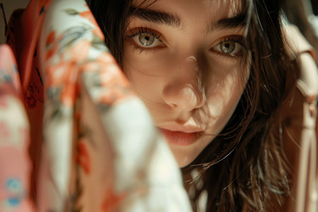 Close-up portrait of a beautiful woman with expressive green eyes, face covered in white and colored scarf. She looks like Scheherazade, the storyteller of One Thousand and One Nights, or a feminist rebel.
