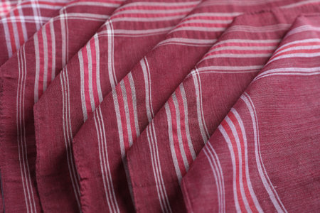 Female hand holds a roll of red and white fabrics against a blurred background. Selective focus. Closeup view